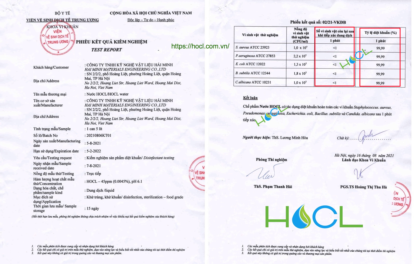 Bộ Y Tế - Viện dịch tễ trung ương công bố kết quả kiểm nghiệm khả năng khử trùng, khử khuẩn của nước HOCL. Kết quả nước HOCL có khả năng diệt 99,9% trong vòng dưới 1 phút.