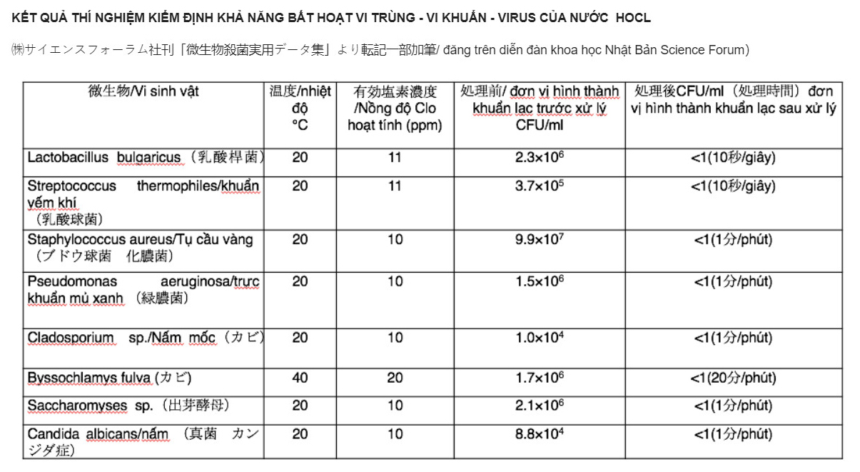 Bạn cũng có thể tham khảo thêm khả năng diệt khuẩn, diệt vi trùng, nấm, virus của nước HOCL được Nhật Bản kiểm định và công bố TẠI ĐÂY