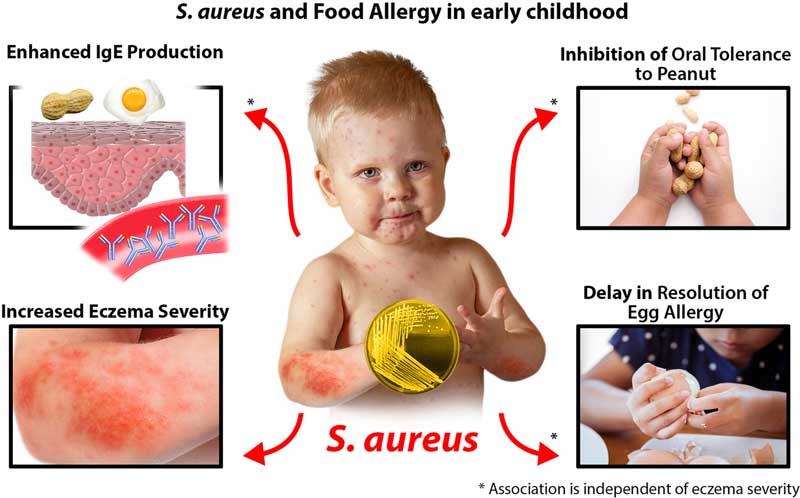 Có nghiên cứu chỉ ra rằng nhiễm khuẩn tụ cầu vàng (qua thức ăn, thực phẩm, ngoài da) làm trầm trọng hơn các bệnh ngoài da như chàm, eczema... ở trẻ.