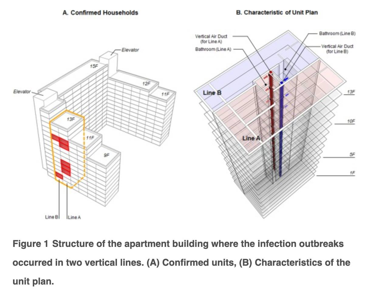 Ờ các khu chung cư, nhất là nơi có mật độ nhiều người chung sống và thông gió kém. Khi có người bị nhiễm, virus Sars-cov-2 có thể phát ra ngoài không khí qua các hạt li ti nếu người bệnh hắt hơi, nói chuyện to, hay cười nói. Virus Sars-Cov-2 từ đó phát tán theo đường thông gió lên hay xuống tùy theo mùa dựa theo nguyên lý Stack.