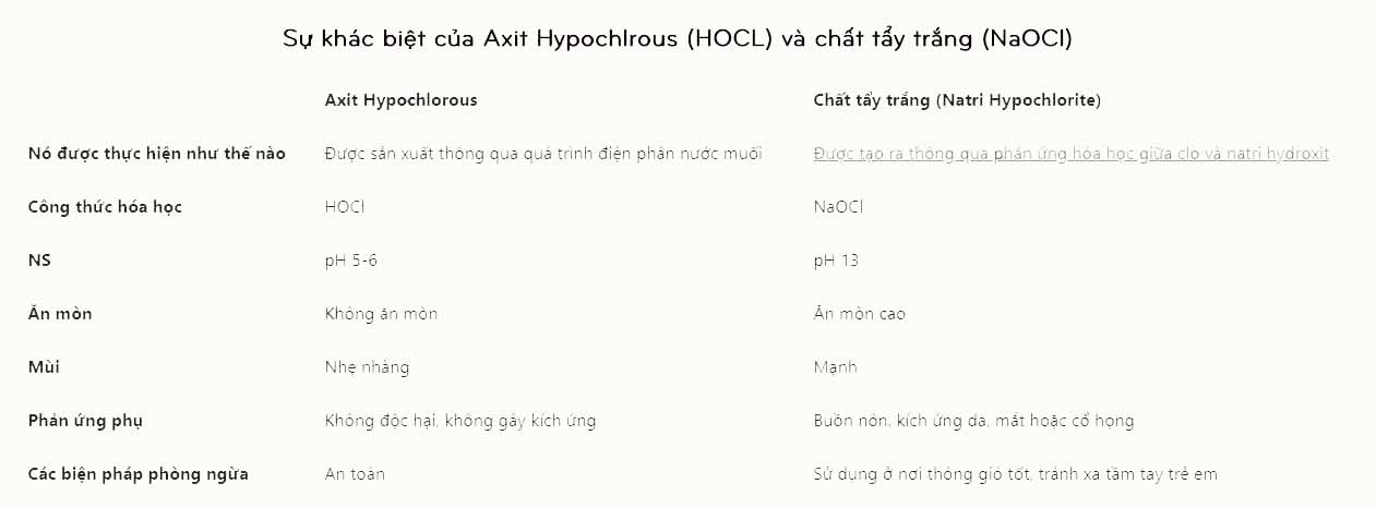 Như bạn đã biết, trên thị trường hiện nay có rất nhiều các chất khử trùng mạnh. Thuốc tẩy -Javen (NAOCL) được sử dụng rộng rãi trong các bệnh viện và cơ sở y tế và có cùng họ clo với HOCl. Nghiên cứu cho thấy chúng đều tiêu diệt vi khuẩn, nấm, bào tử và vi rút. Tuy nhiên, chất tẩy trắng rất dễ gây kích ứng cho mắt, da và phổi nếu hít phải trong thời gian dài có thể gây ung thư. Ngược lại, HOCl có mùi clo tạm thời và nhẹ, tan nhanh, không gây kích ứng và không có tác dụng phụ độc hại.