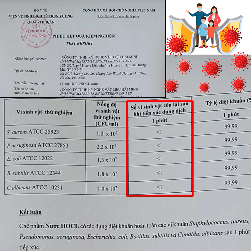 Bộ Y Tế - Viện dịch tễ trung ương công bố kết quả kiểm nghiệm khả năng khử trùng, khử khuẩn của nước HOCL. Kết quả nước HOCL có khả năng diệt 99,9% trong vòng dưới 1 phút.