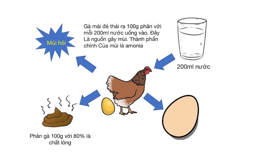 - Gà mái đẻ thải ra 100g phân với mỗi 200ml nước uống vào. Đây Là nguồn gây mùi. Thành phần chính của mùi là amonia.
