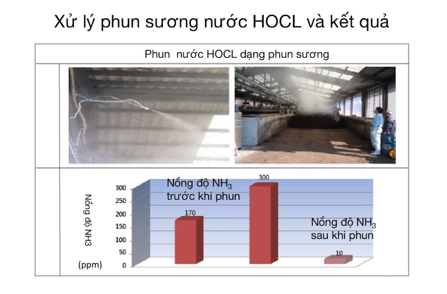Để xử lý NH3 chúng tôi đề xuất sử dụng nước HOCL, với thành phần chính là HOCL với khả năng ô xi hoá cực mạnh nước HOCL có thể xử lý được vấn đề khi sử dụng nước HOCL sẽ xảy ra phản ứng hoá học