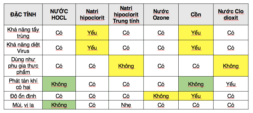 Ghi chú: HOCL tiêu diệt được cả bào tử khuẩn mà một số loại chất khử trùng khác không có khả năng tiêu diệt