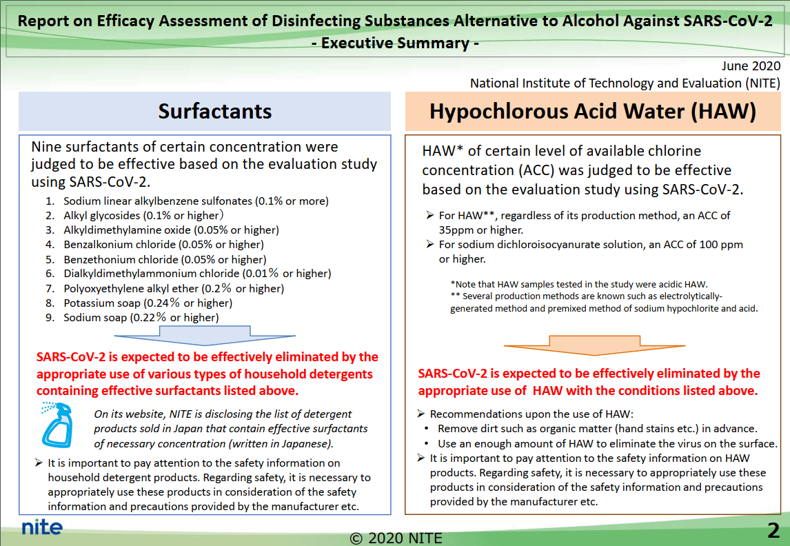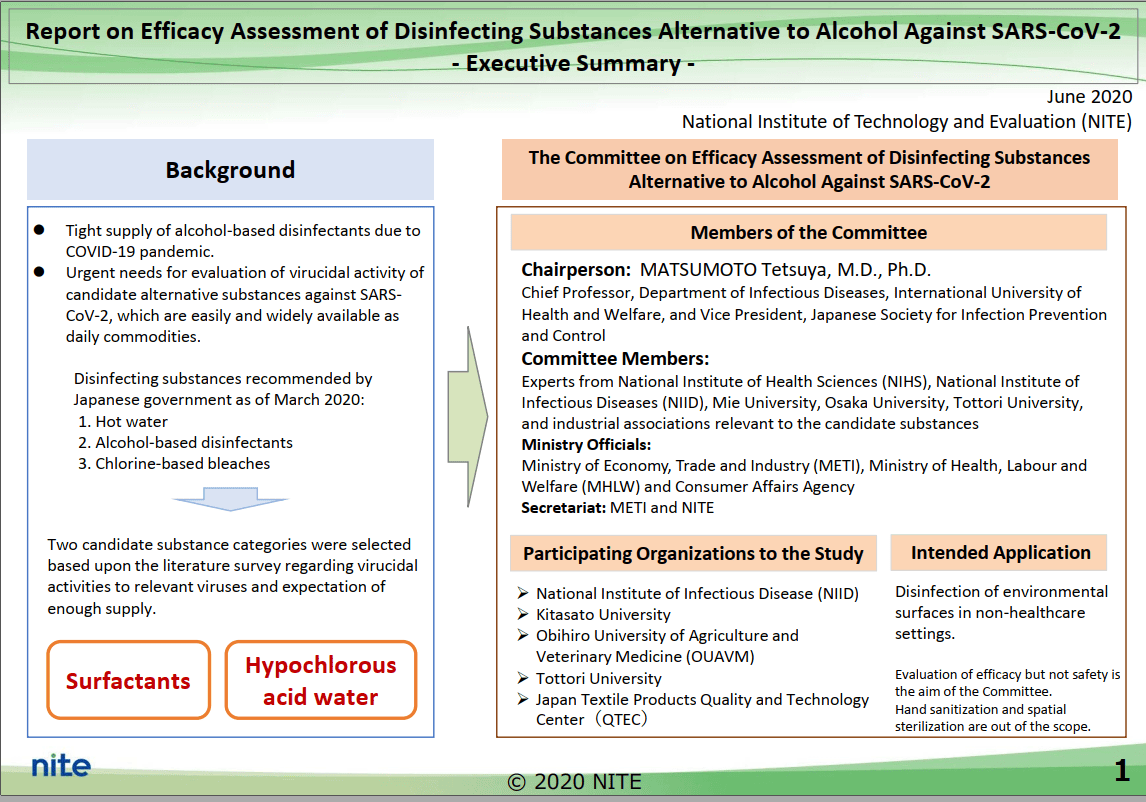 Theo đó, NITE đã thành lập Ủy ban Đánh giá hiệu quả của các chất khử trùng thay thế cho cồn trong hoạt động tiêu diệt SARS-CoV-2 dựa trên yêu cầu của Bộ Kinh tế, Thương mại và Công nghiệp (METI). Kể từ đó, Ủy ban đã thực hiện đánh giá hiệu quả hoạt động diệt virus của một số chất chống lại SARS-CoV-2 nhằm mục đích khử trùng bề mặt môi trường trong các hộ gia đình và môi trường cộng đồng.